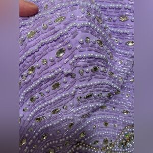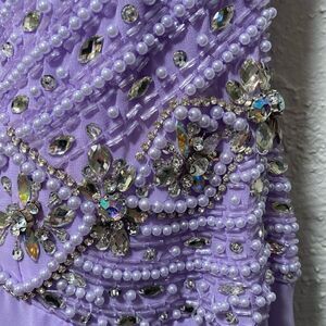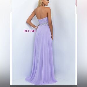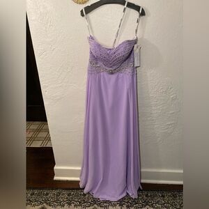 NWT. This dress is discontinued and beautiful. The first two shots are of this exact dress, the blue one is this dress in a darker color to see the beautiful design of the stones. Sweetheart neckline. Has rubber lined top to keep the dress up. Has sewn in padding. Has a few beads missing or loose, but is to be expected. Has a little pulling at the bottom of the zipper ,but no separating and a small snag at the bottom. Perfect color for spring. Great for prom or sweet 16 party. Longer in the back. Never worn. Please inspect pictures carefully and use zoom feature. Pictures are part of the description. Sold as is. No returns.