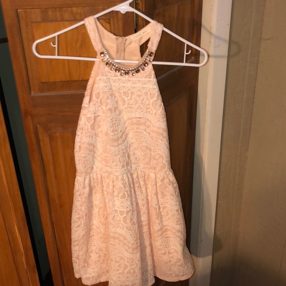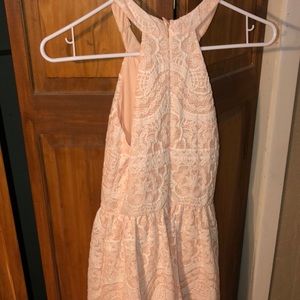 Blush/White lace dress. Above the knee. Sequences design at neck of dress. Wore once.