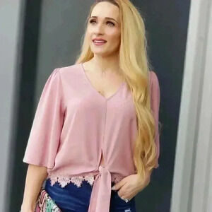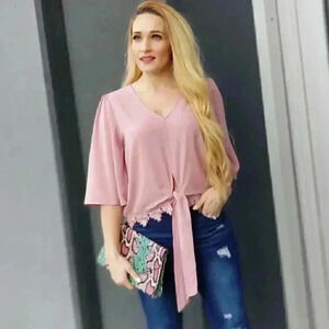 This Blushing Babe Chic Blouse is just what you need for the season. With its flowy flutter sleeves, tie front details and crochet lace hem. This slip on top is perfect to pair with jeans and heels for a chic effortless look.