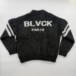 NWOT Blvck Paris fuzzy mohair sweater featuring white chest and sleeve stripes and a bold “BLVCK PARIS” logo across the back. Soft, warm, and perfect for a streetwear or minimalist outfit.