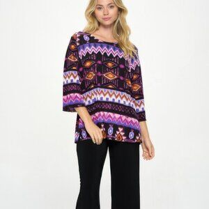 Designed for both comfort and personality, this merrow-edge top features a fun lettuce hem and classic quarter sleeves. Its wrinkle-free fabric makes it ideal for travel or busy days, while the soft stretch ensures a flattering fit. Whether dressed up with statement accessories or kept casual, it’s a reliable wardrobe staple. Made in the USA with comfort in every stitch.