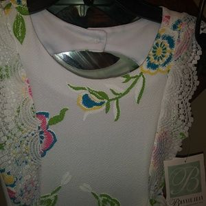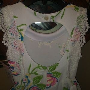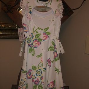 Gorgeous raised floral dress w intricate lace. This dress is sinched in the sides and ties. The back has an open back buttons at the top and zips. Thos would be perfect for easter 🐣. Has just enough twirl to it.