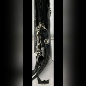 Design: It features the iconic black and gray signature pattern on the canvas material, with black leather or patent leather trim and a convenient wrist strap for easy handling.
