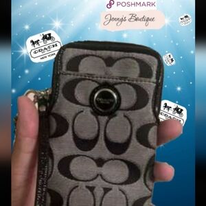 The item in the image is a bnwt Coach Signature Peyton Black and Gray Wristlet cellphone wallet case organizer. This universal stylish accessory is designed to be a compact and convenient solution for carrying essentials, functioning as a small clutch or a phone wallet.