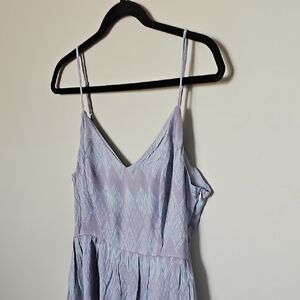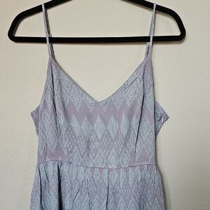 Elegant lavender dress with spaghetti straps. Features a unique geometric pattern. Spaghetti straps that adjust. V neck. Lavender and soft blue colors. Lightly lined. Hidden side zipper closure. Bow detail in the back with a big cut out in the back. Mini sundress. So adorable! Date night, dinner, occasion, gathering, event, church, shower, spring, summer, feminine.