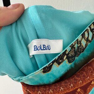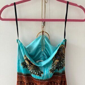 Blue and brown tribal/aztec/pirate pattern; lined; strapless with a rope tie around the neck with an o-ring; funky pattern, bohemian, festival, Indian, eastern Asian