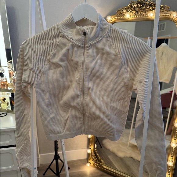 Stylish cream zip-up jacket with ribbed texture. Perfect for layering.