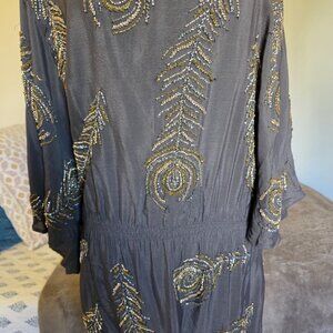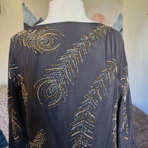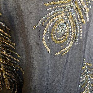 Beautiful semi-sheer black viscose with metallic gold & iridescent beaded peacock feather designs throughout. Flowy boho silhouette with wide sleeves and elastic waist — super flattering and perfect for events, travel, or holidays.