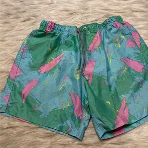 Swim Shorts by Boardies in an aqua with Green/Pink/Yellow paintstroke / paintsplash print. Elasticized waist with exposed drawstring. Pull-on style. Back pocket with Boardies patch. Gently worn with no visible flaws. Measurements in photos.