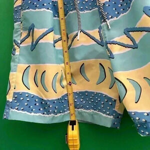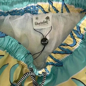 Boardies men’s swim trunks size M, 5” inseam, elastic waist band, yellow, white, blue, turquoise, and black