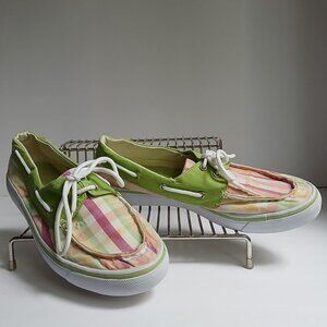 Blue Fin Boat Shoe/Sneakers Pale Green With Pink & Green Plaid White Soles & Laces Size 8