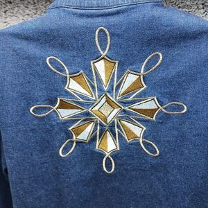 Bob Macke Wearable Art Embroidered Stretch Denim Shacket. Woman's Small. Blue... Embroidered in a 90's Western Rodeo Style. *Front side pockets sewed closed for better fit.