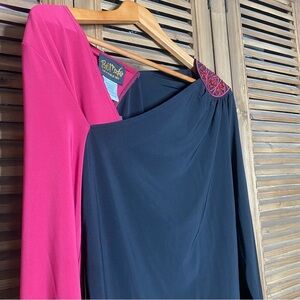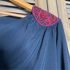 Bob Mackie, wearable, art, black, and red, elegant angled neckline leads to red bling medallion lightweight comfortable wash and wear. Size small she measures pit to pit 20 inches and is 27 inches from shoulder to bottom hem. In pristine new with tickets condition smoke free home.