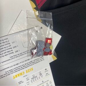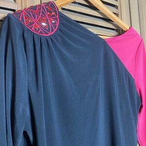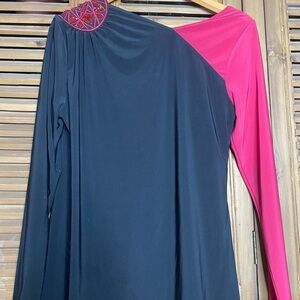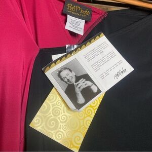 Bob Mackie, wearable, art, black, and red, elegant angled neckline leads to red bling medallion lightweight comfortable wash and wear. Size small she measures pit to pit 20 inches and is 27 inches from shoulder to bottom hem. In pristine new with tickets condition smoke free home.