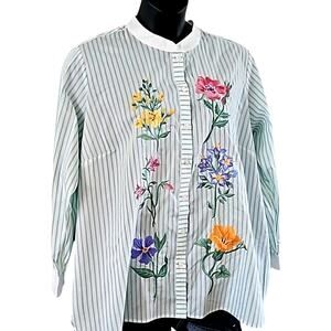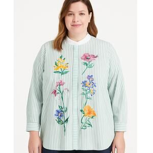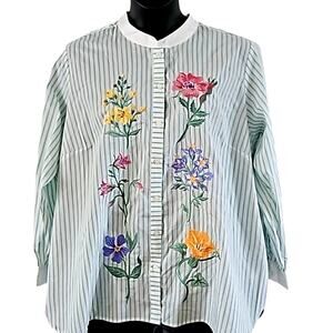 Bob Mackie Art Floral Embroidered Blouse Women’s Size 2X NWT Button Down Stripe