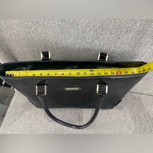 Discover the sophistication of the Bob Mackie Black Tote, featuring a crocodile embossed texture and a structured silhouette. This elegant bag combines style and practicality, making it an ideal accessory for any occasion.