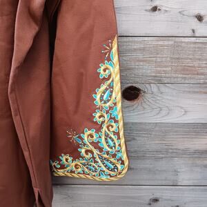 This beautifully embroidered tunic has it along the neckline and sleeve cuffs. With the intertwining of the blues, golds, and browns it most definitely brings art onto the fabric.