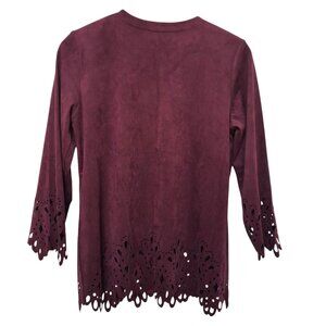 Bob Mackie Burgundy Faux Suede Open Front Cardigan/ Jacket Laser Cut Detail XS/S