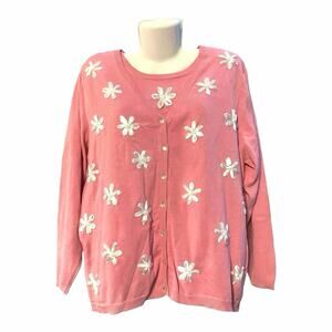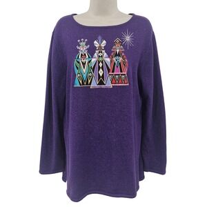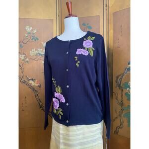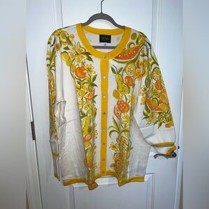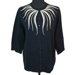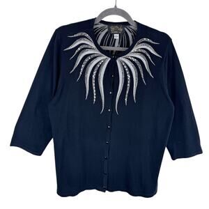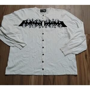 The Bob Mackie Cardigan in size XL is a stunning piece of wearable art designed for women who appreciate artsy and colorful styles. Made from a blend of rayon and cotton, this knit sweater features a button accent and 3/4 sleeves, making it a versatile and lightweight option for Boho resortwear. The blue color and vintage theme add a unique touch to this sweater, making it a standout piece in any wardrobe. Perfect for women who love to express themselves through their clothing choices.
