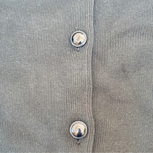 Tunic length V neck cardigan with front patch pockets and round black buttons