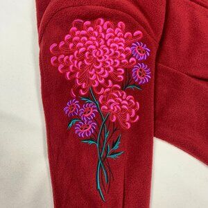 Elevate the cozy season with this signature Bob Mackie Wearable Art fleece jacket — a rich crimson red with breathtaking floral embroidered sleeves that turn a simple layer into a statement piece. Known for theatrical design and head-turning detail, Mackie’s specialty shines here.