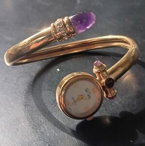this is a rare and beautiful Bob Mackie gold ladies watch with a absolutely unique design like all of Bob Mackie designs . there are 3 perfect all natural amethyst on this watch and a beautiful round cut garnet and no clasp the wath is it's own clasp it smoothly wraps around the wrist and holds the watch super secure and comfortable .