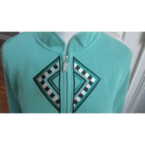 Bob Mackie Laser Cut Full Zip Front Knit With A Geometric Green and Black Diamond Embroidered design , Long Sleeve Teal Green with a Mock Collar. Cotton / Poly. Perfect Condition appears Unworn. Size Large Chest 40" ( zipped ) Length 24"
