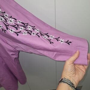Elegant purple three-quarter sleeve jacket with floral embroidery and a button-up front. New with tags.