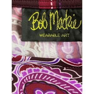 Bob Mackie is known for his elaborate, glamorous designs, often incorporating intricate patterns and bold colors. This blouse, with its vibrant paisley print and silky liquid knit fabric, exemplifies his signature style.