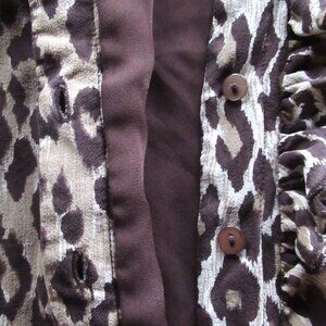 This lovely leopard print chiffon blouse has been very gently used. There are NO stains/holes/missing buttons. The closure is small brown plastic buttons and a string. Button holes are hidden in the hidden button placket. The front is decorated with 2 rows of ruffles. A string of ruffles goes around the neck to form a ruffle neckline. Sheer flounce sleeves add a flare to this blouse.