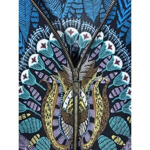 Bob Mackie Top 2X Black Blue Purple Feather Print 1/2 Zip Satin Tribal Peacock