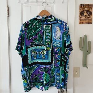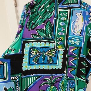 This Bob Mackie Wearable Art shirt is a unique piece that will make you stand out in any occasion. Made of 100% silk, this shirt features a collared neckline, short sleeves, and a button closure. The multicolor white, purple, green, and. Blue print is inspired by Hawaiian art and features a range of nature, hippie, nautical, and tropical themes, including cats, fish, monkey, and Hawaiian flowers.