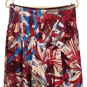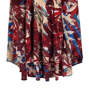 Pull on style high low maxi skirt - shades of red, maroon, cream, tan & blue. Abstract tropical leaf boho pattern. Back is longer than front. Elastic waist. Inner maroon lining. 100% Polyester. Hippie, boho, bohemian