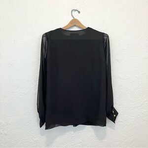 Black chiffon blouse top. White and metallic gold embroidery on the top. Gold button detailing. Long sheer sleeves. Lined. NWOT. Never worn. Excellent condition.