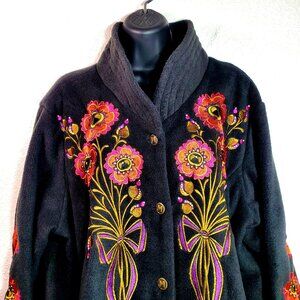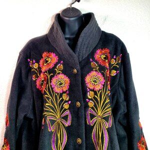 This floral embroidered coat provides warmth and elegance with its button-up design and artistic details. Suitable for layering in cooler temperatures.