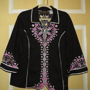 This jacket is in like new condition . Pink and white embroidery with eyelet design.