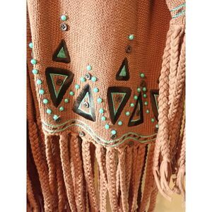 Bob Mackie Wearable Art Brown Full-Zip Sweater Beaded Turquoise Fringe Medium