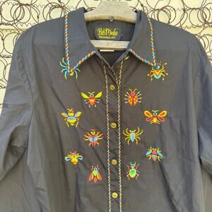 Bob Mackie Wearable Art Bug Embroidered Black Long Sleeve Button Front Shirt LG
