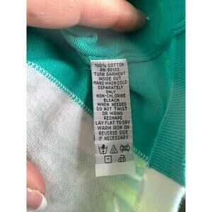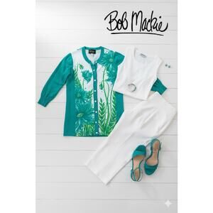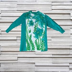 This gorgeous cardigan has beautiful shades of teal and green on white. White button front. Soft cotton fabric. Excellent smoke free home.