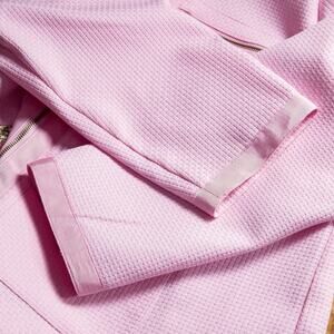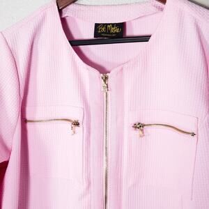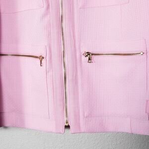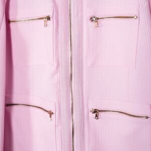 This Bob Mackie Wearable Art jacket blends barbiecore energy with sophisticated prep, shaped by its pastel pink tone, clean structured lines, and subtle textured finish. The gold zip pockets add an artful statement detail that keeps the piece polished while still playful in that Cher-from-Clueless way.