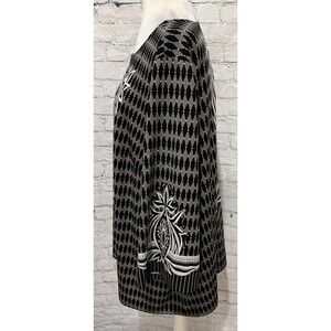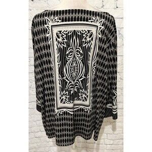 The Bob Mackie Wearable Art Placed Print Knit Pullover Top in black and white is a stylish and versatile piece perfect for various occasions such as travel, parties, casual wear, work, or business meetings. This top features a geometric pattern, long sleeves, and a round neckline for a comfortable and classic look. Made from a polyester blend knit fabric, this tunic-style pullover is designed for plus size women in size 3XL, offering a flattering fit and a touch of artistry to any outfit. Perfect for the winter, fall, or spring seasons, this top from Bob Mackie is a must-have for any fashion-forward woman. 28 inches pit to pit and 29 inches long. Smoke free home.