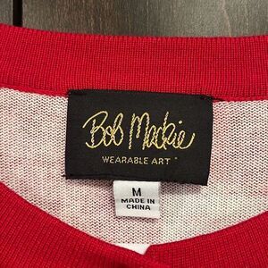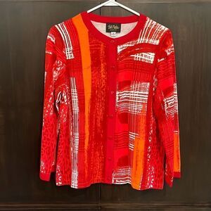 This cardigan is made by Bob Mackie. It’s a red button front sweater size medium and in very nice pre owned condition. Smoke and pet free home.