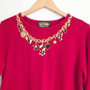 Bright red Bob Mackie Wearable Art sweater with embroidered charm necklace neckline and split hem- Christmas sweater potential