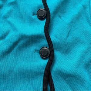 Easy layering piece in a fun teal blue, button closure, scallop trim in black, pockets, botton blend, spare button and tags.