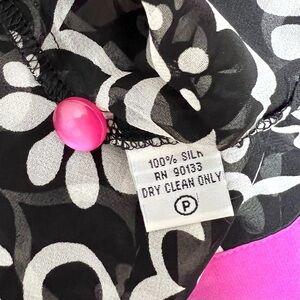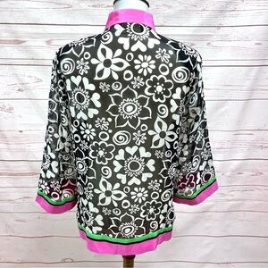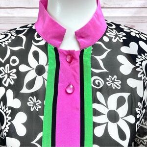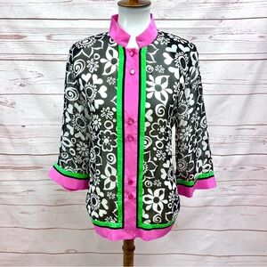 Bob Mackie Wearable Art Sheer Floral Kimono Blouse. Sheer mid black and white floral bodice with neon green and fuchsia trim and jewel tone buttons. Mandarin collar and kimono sleeves. Perfect as a beach / swim coverup Size Medium in great condition.