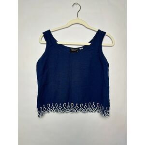 Beautiful linen set with sleeveless top and open front lightweight jacket. White eyelet embroidered details. Some light wear/marking on the underarm area of the tank but otherwise in beautiful condition! Same or next day shipping, offers welcome!