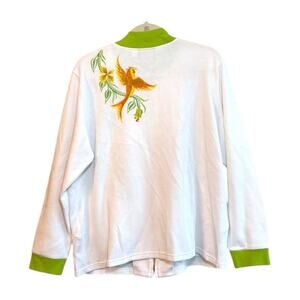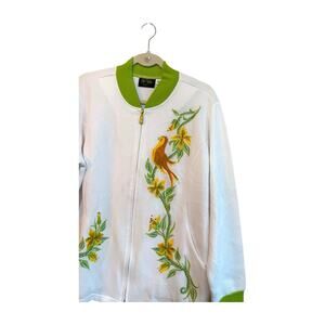 Bob Mackie Wearable Art White/Green Embroidered Bird Zip Up Sweater Sz XL NWOT