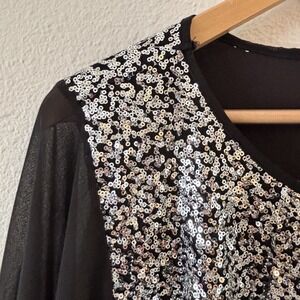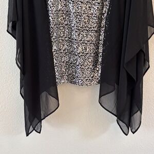 Features intricate silver sequin front and back panel with draped sheer black chiffon poncho sleeves