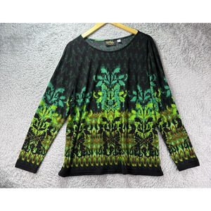 Bob Mackie Wearable Art XL Green Black Pullover Top Geometric Liquid Knit Boho