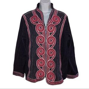 Bob Mackie wearable art Black Denim Plus size Jacket. Beautiful red and white embroidery. Logo zipper tabs and buttons